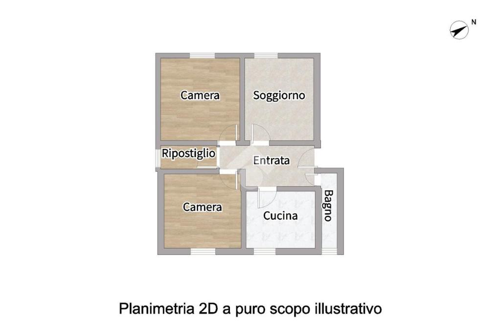 L'immobile vede la seguente distribuzione interna: ingresso, cucina abitabile, soggiorno, due camere da letto, bagno finestrato con box doccia e infine un ripostiglio.