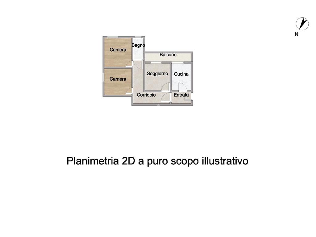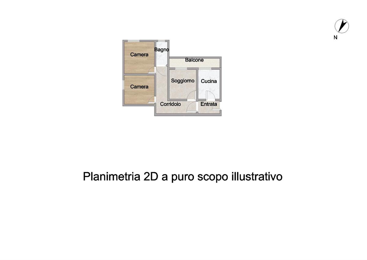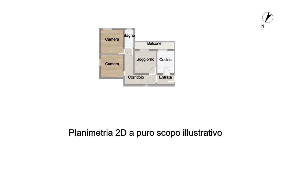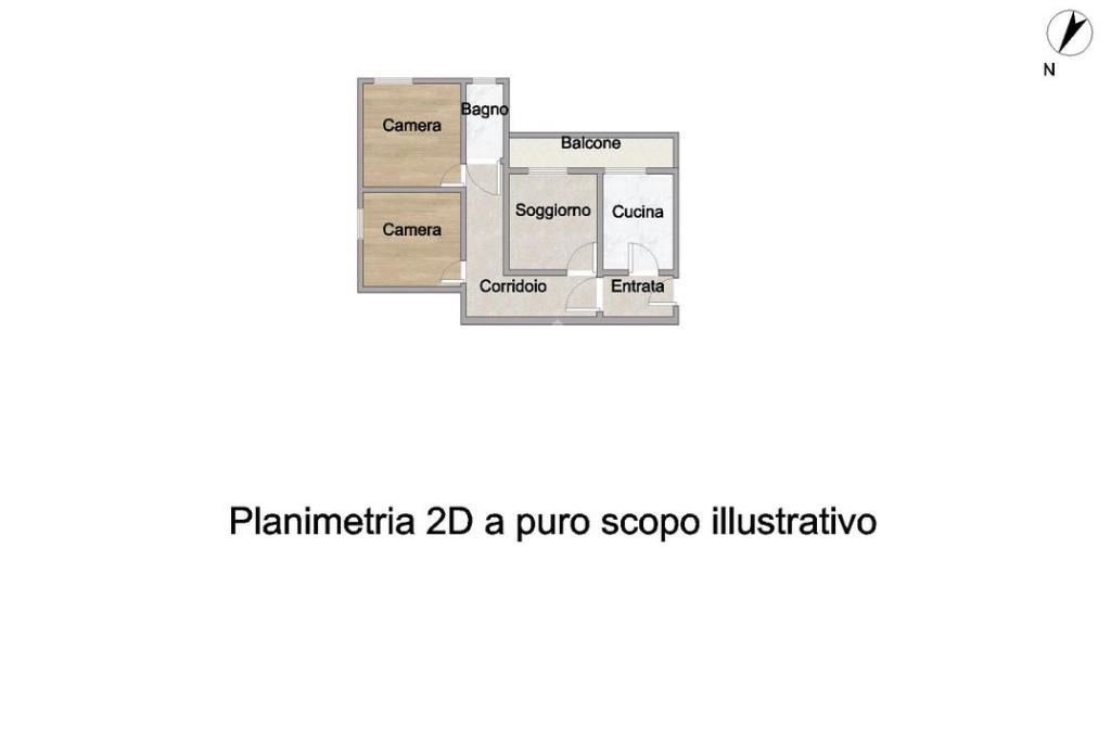 L'immobile vede la seguente distribuzione interna: ingresso, cucina abitabile con affaccio su balcone, soggiorno anch'esso con balcone, due camere da letto e infine un bagno finestrato con vasca.