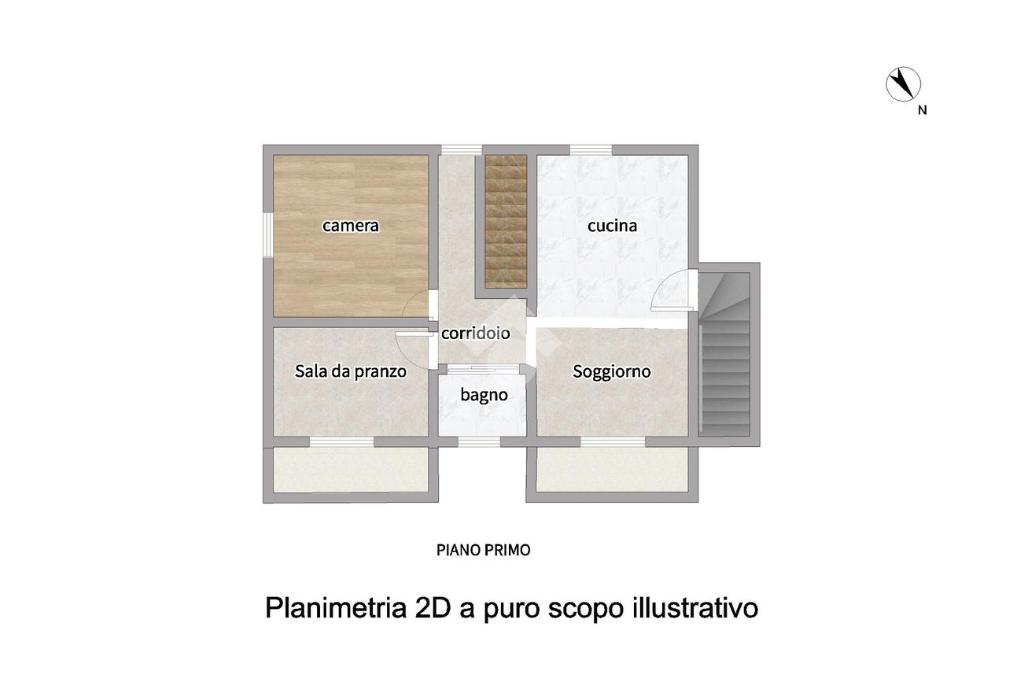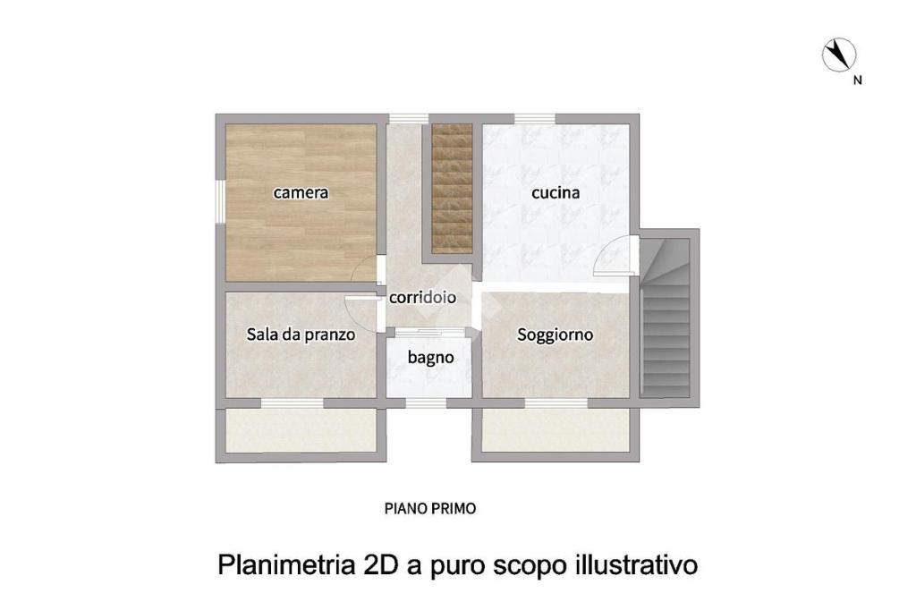 Al piano primo si sviluppa la zona giorno, composta da un ampio open space con cucina e soggiorno dotato di camino e affaccio su balcone, una sala da pranzo luminosa anch’essa con uscita su balcone, un bagno finestrato con box doccia e una camera da letto matrimoniale.